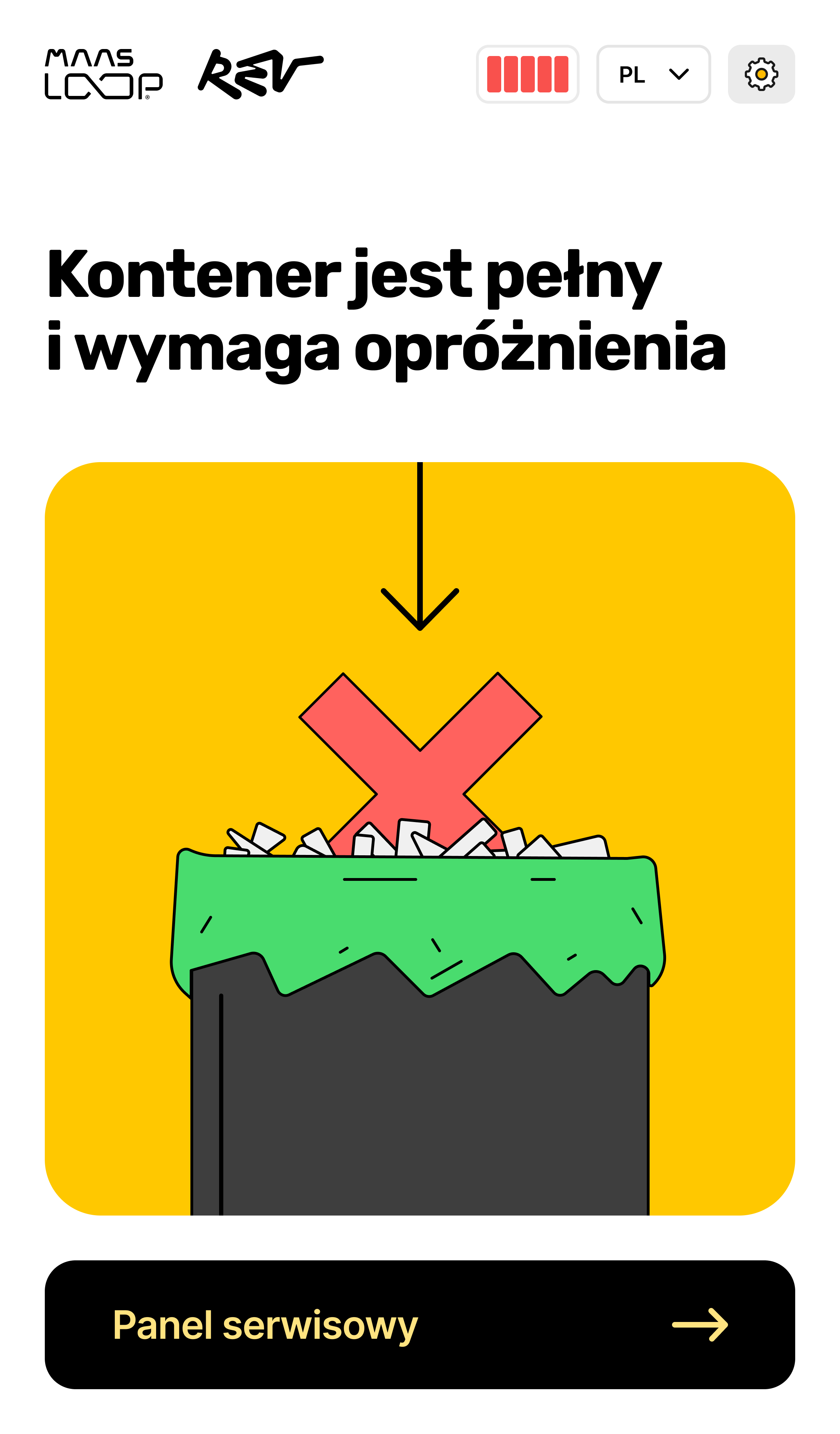 Wejdź do Panelu Serwisowego i naciśnij przycisk "Opróżnij kontener" (ikona kosza w prawym górnym rogu).