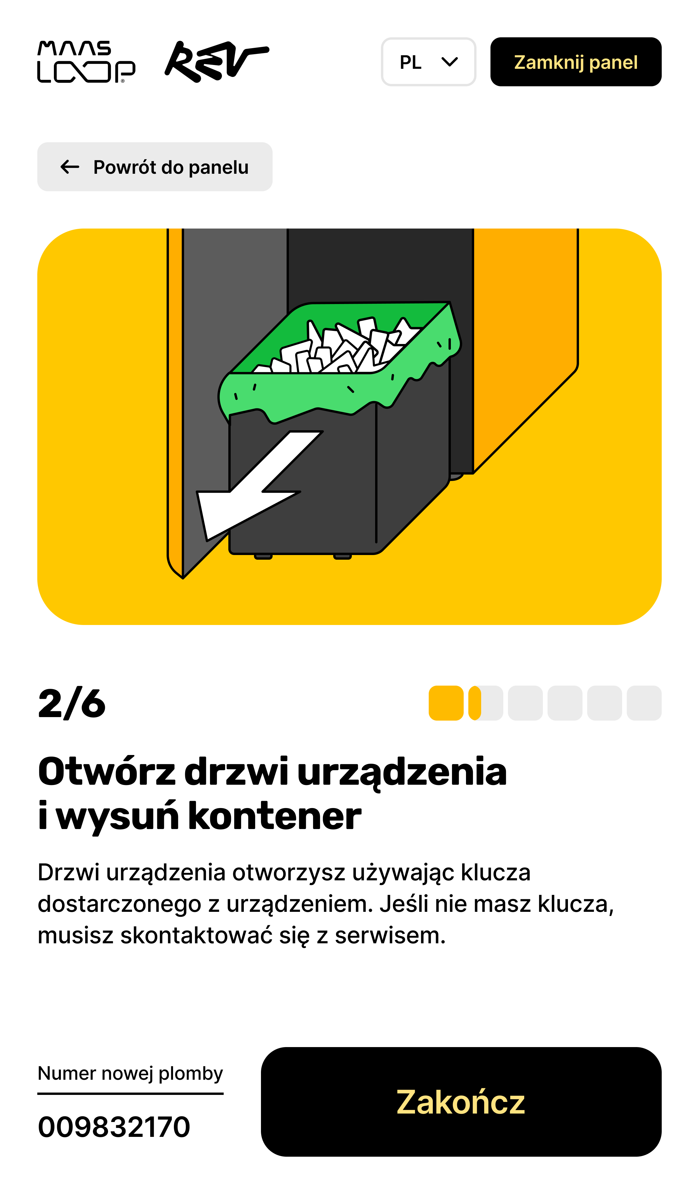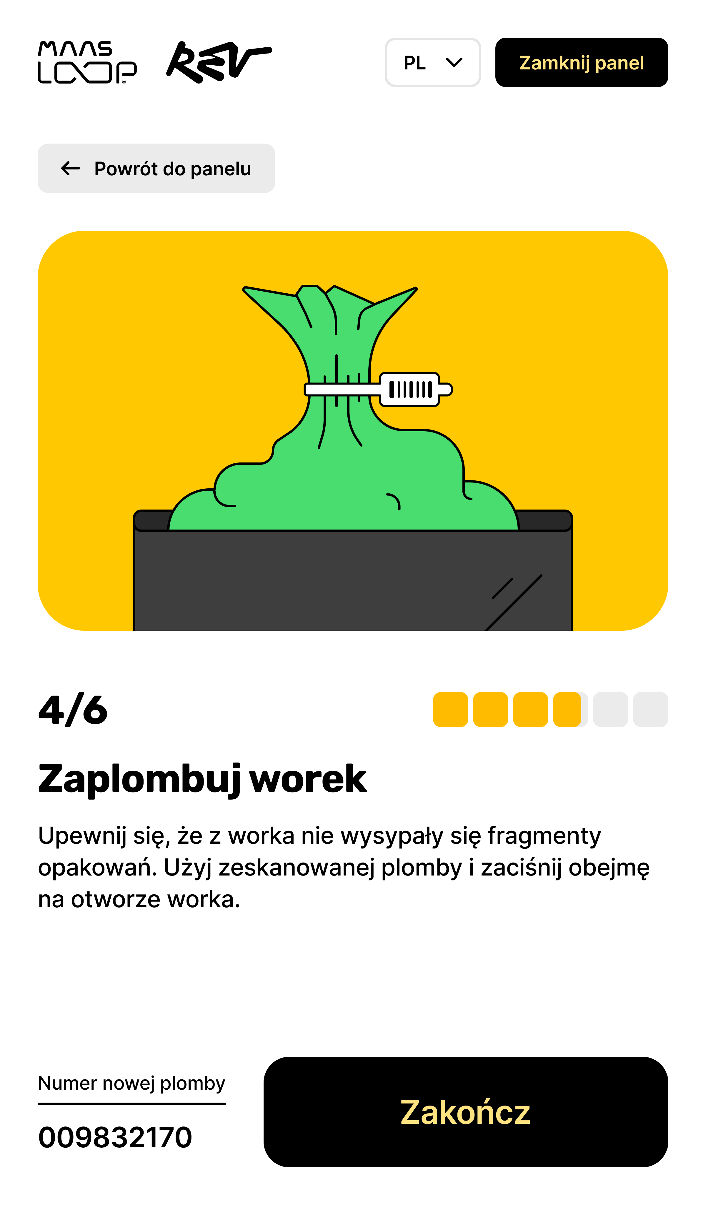 Odstaw pełny i zabezpieczony plombą worek na zaplecze w wyznaczone miejsce. Miejsce to powinno być dostępne dla operatora, który zajmie się jego dalszym przetwarzaniem. Na ekranie potwierdź zakończenie procedury.