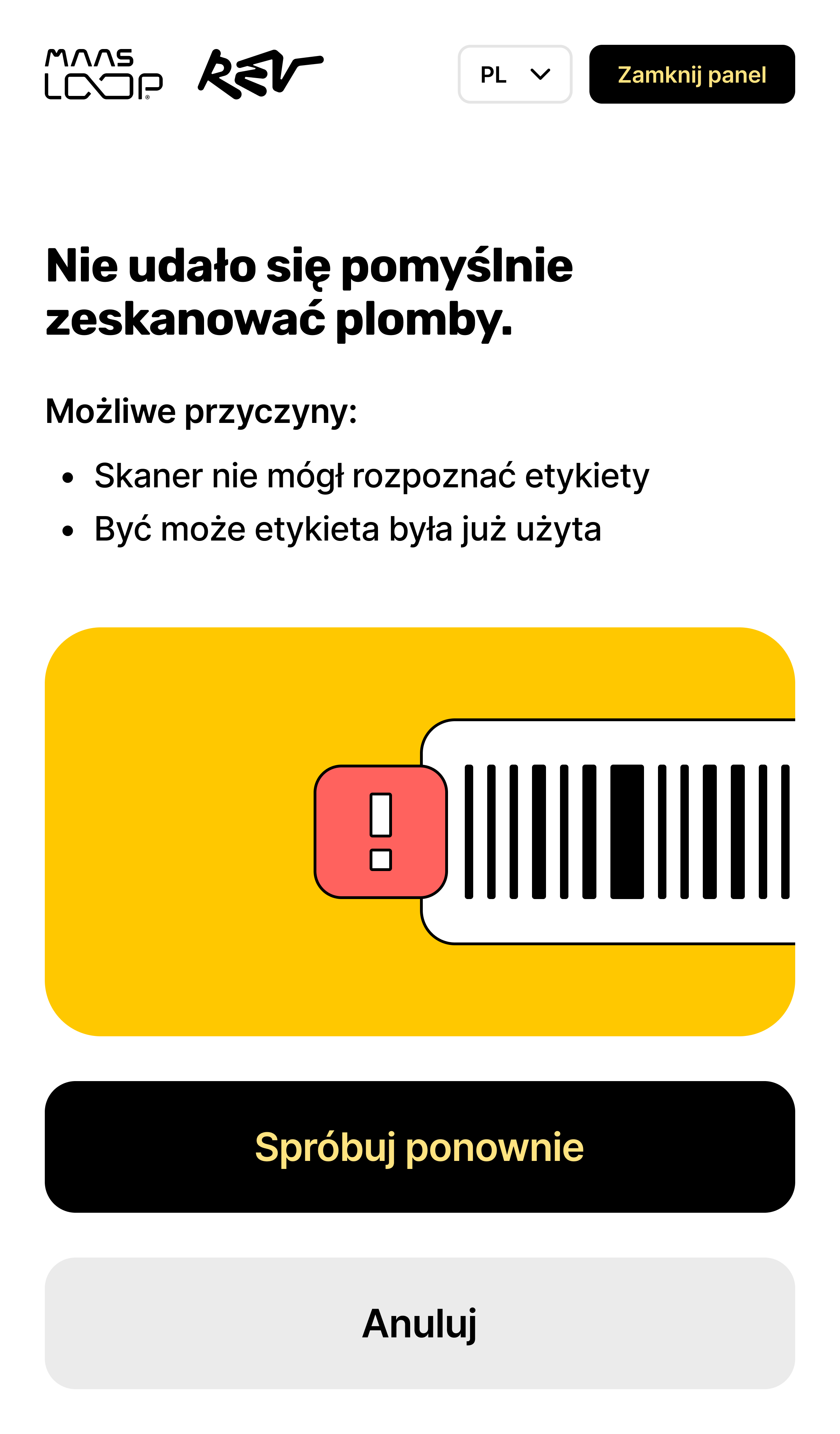 Sprawdź, czy plomba nie została już użyta (system blokuje duplikaty). Sprawdź, czy kod nie jest zagięty lub czy skaner widzi etykietę. W razie problemów użyj innej plomby i zgłoś wadliwą operatorowi.